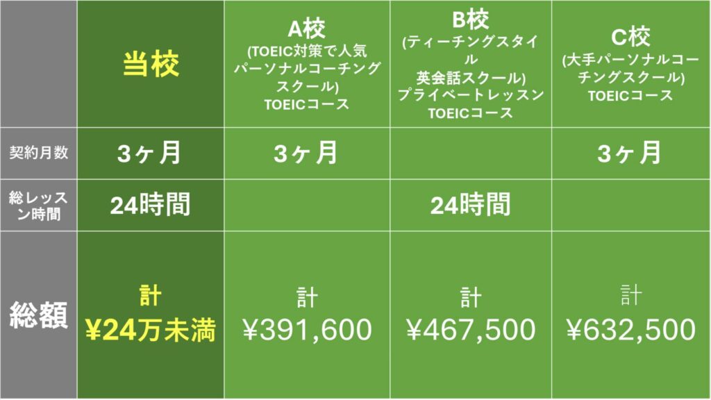 ✅週に2時間以上レッスン✅宿題あり✅レッスンスケジュールはあらかじめ1ヶ月分決定 (レッスンキャンセルの際はキャンセルのご連絡がいつであっても100%キャンセル料がかかります)✅半年以上受講してもスコアアップしなかった場合の返金保証つき(条件あり)